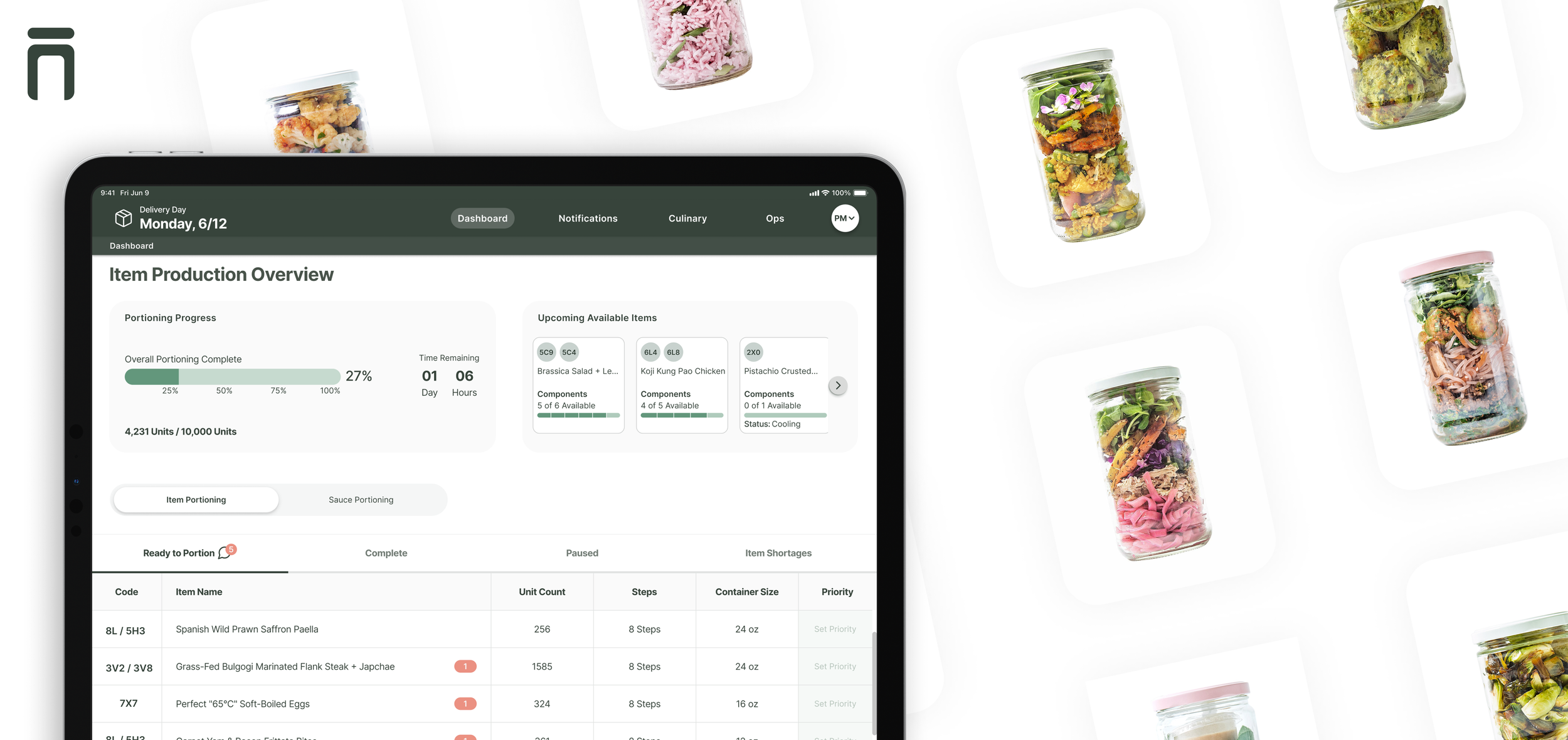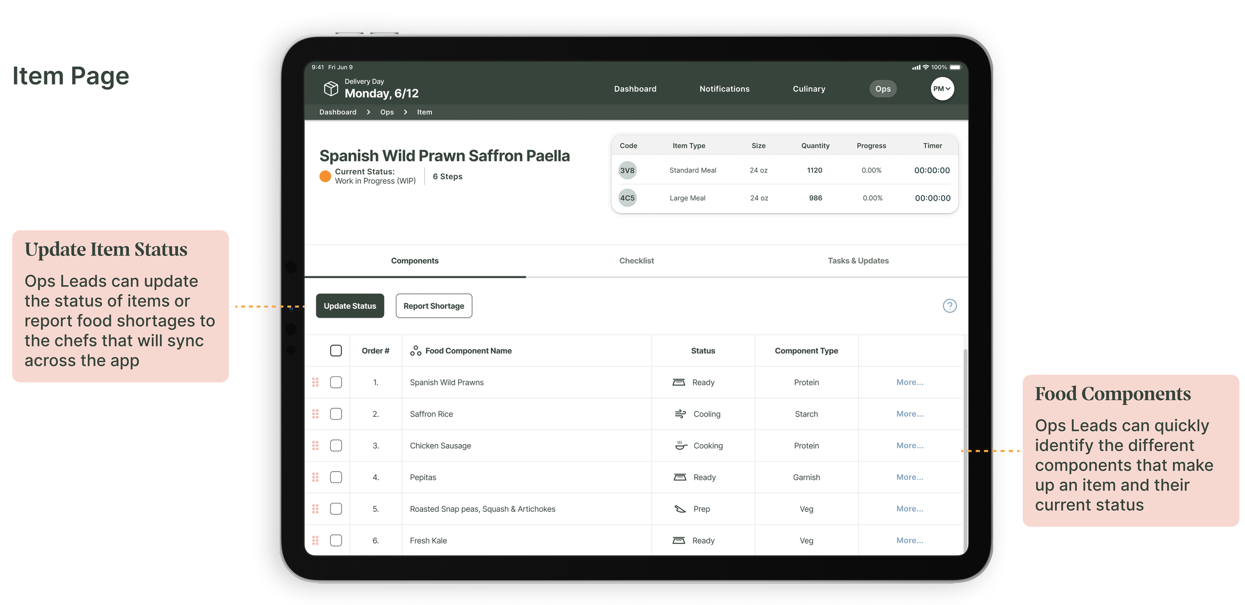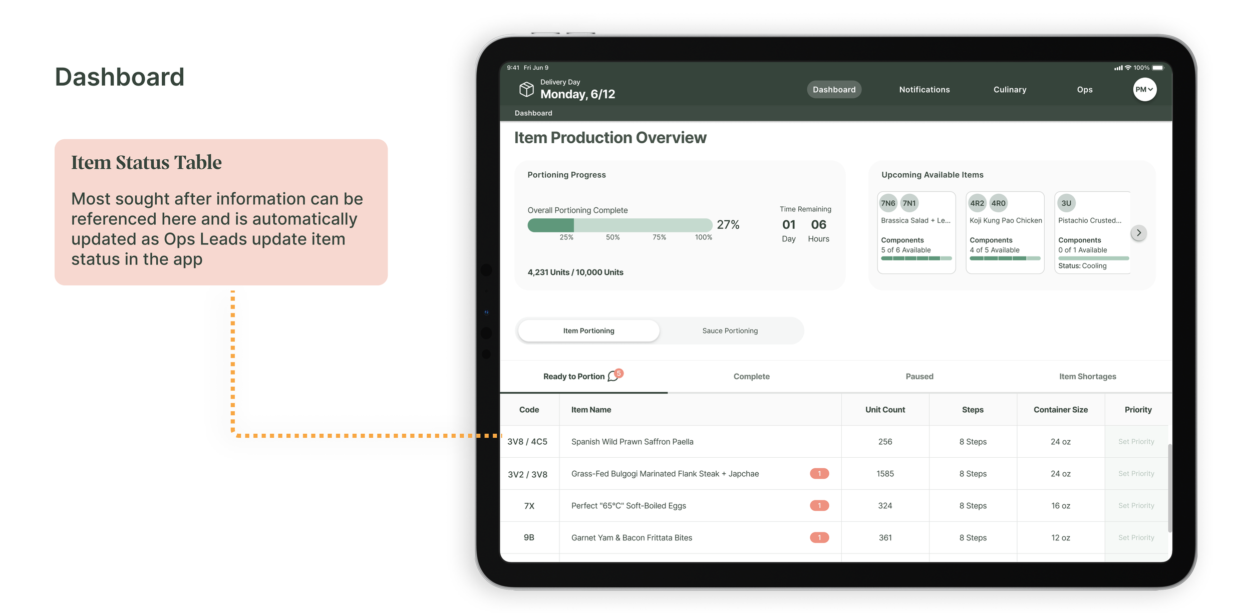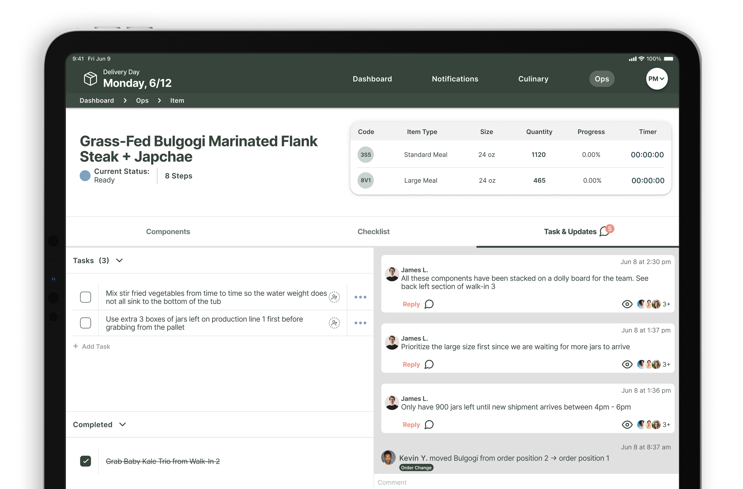 Tablet dashboard solving for communication gaps in food production operations at meal prep startup