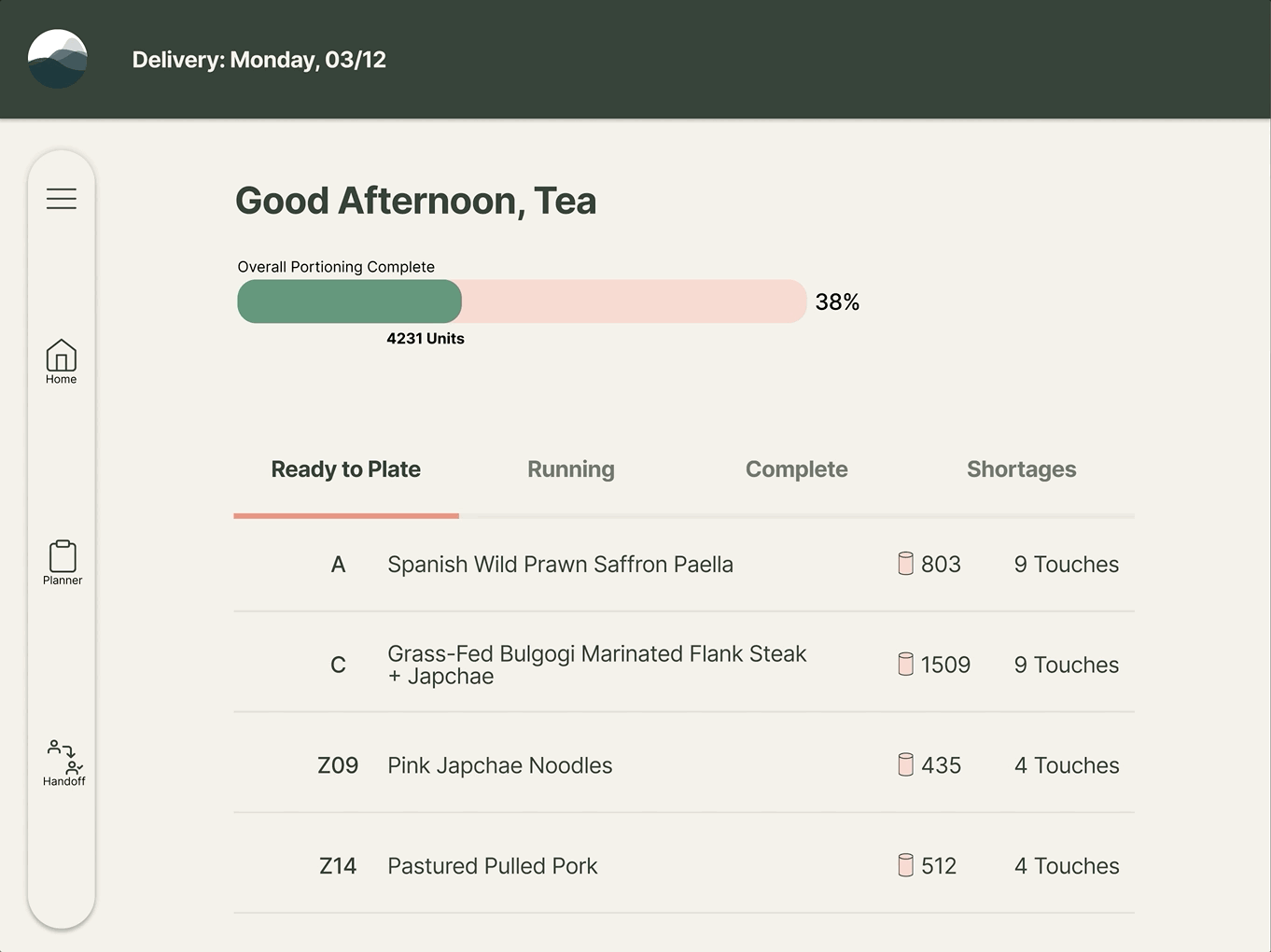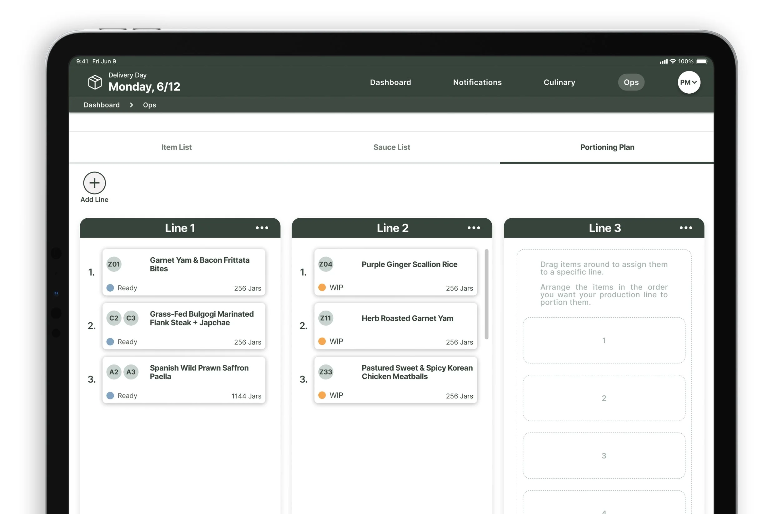 The Portioning Plan gives the Ops Lead a space to visually plan the production lines.