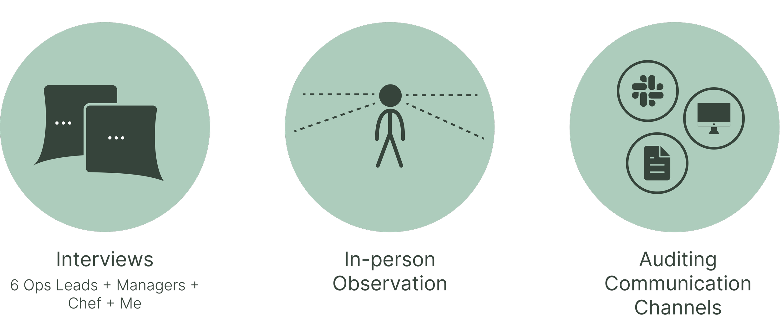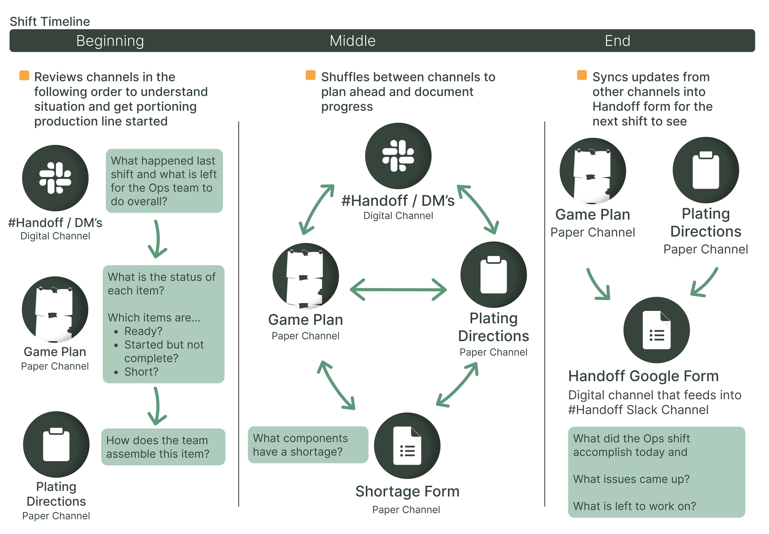I reviewed 6 channels for communicating information. Ops Leads and Chefs have to manually sync these channels to keep them up to date.