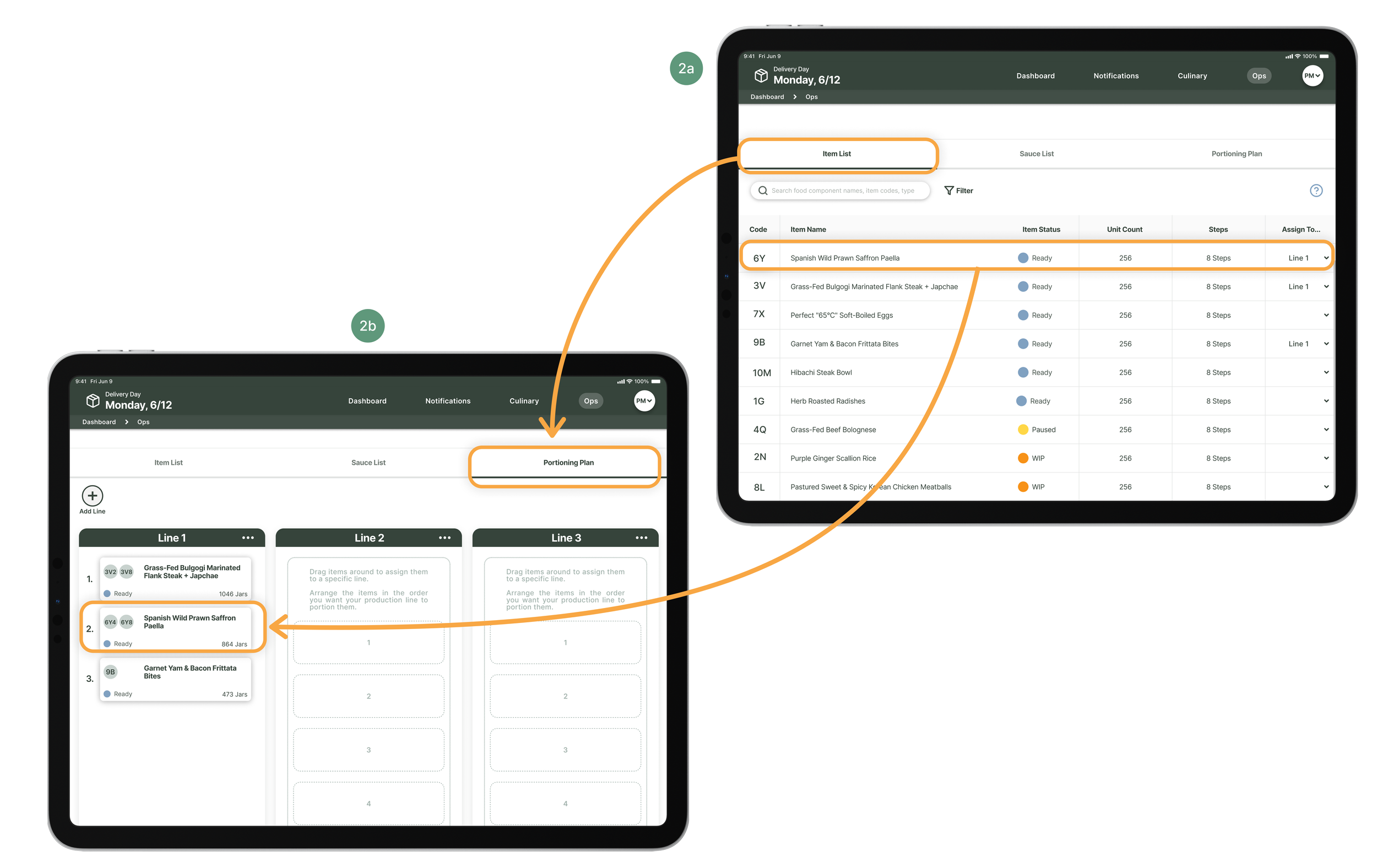 When the Ops Lead switches to the Portioning Plan tab, they can see that the Spanish Wild Prawn Saffron Paella was added to Line 1 - See 2b